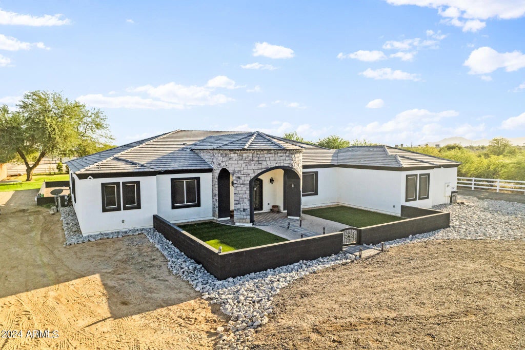 NEW PRICE REFLECTS A RECENT PROFESSIONAL APPRAISAL! Stunning Ranch-Style Luxury Home with Horse Rights on 1.5 Acres! Welcome to your dream home, nestled on a sprawling 1.5-acre lot with horse rights and full irrigation. This meticulously crafted home offers 4 bedrooms, 3.5 bathrooms, and a 3-car garage complete with epoxy flooring. As you enter through the custom iron doors, you're greeted by a stunning open-concept layout featuring sleek white ceramic tile flooring throughout. The kitchen is a chef's delight with dark custom cabinets, white quartz countertops, sleek concrete countertops, and elegant gold fixtures. High-end stainless steel appliances, provide added convenience and a touch of luxury. The adjacent spacious laundry room offers extra storage and functionality.