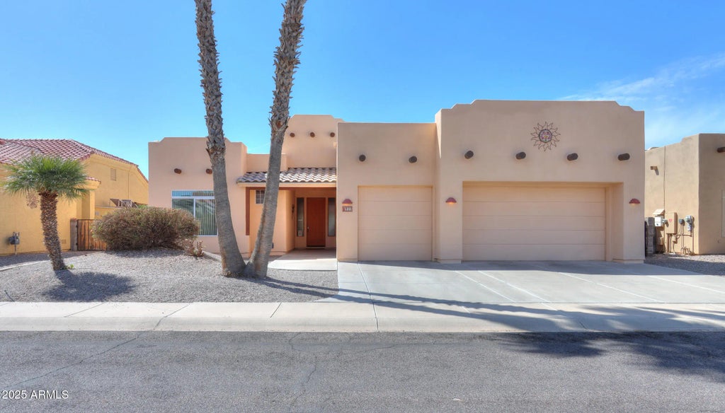 This semi-custom Santa Fe style home features an open floor plan, large living room with an eat-in kitchen area. The kitchen features Corian counters, lots of storage/cabinets, stainless steel appliances (gas stove) and a breakfast bar countertop. The bedrooms are split and the master bedroom comes with a bay window, double entry doors and a large bathroom with a walk-in closet, double sinks and separate tub and snail shower. The large laundry room with extra cabinets/counter leads you to the spacious 3 car garage. The extended covered patio views an oasis of a back yard. Artificial turf, pavers, gravel and automatic drip system make this yard very low maintenance. Enjoy the shade of the mature trees when you sit out back and enjoy a cup of your favorite drink. Golf course near by.