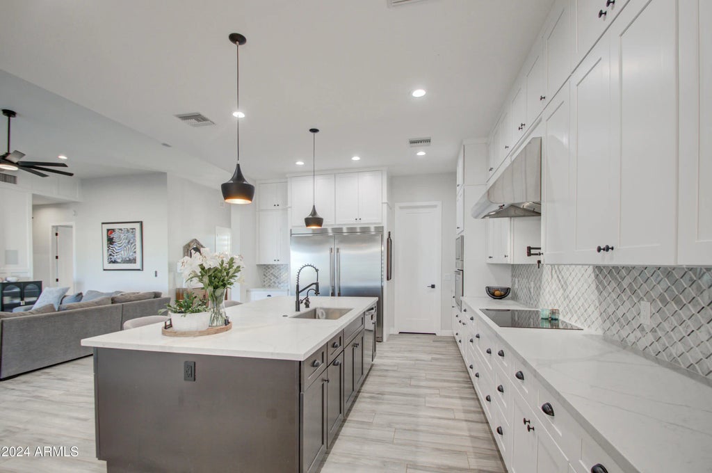 STUNNING 5 bedroom, 4.5 bath home on a 1.25 acre flood irrigated parcel on PAVED road. The front patio leads you into a fabulous great room with fireplace and huge doors to the outside. The gourmet kitchen is full of fabulous features: cabinets to the ceiling, double ovens and cooktop, island, quartz countertops, fridge & freezer, pot filler. The primary suite has his and hers closets. 4 other bedrooms with walk-in closets and attached baths. Off the foyer/great room is a guest bath and a den with barn door. The laundry room can be entered from either side and has barn doors on each side. The covered patio is made for entertaining and relaxing. Oversized 4 car garage has overhead storage. RV gate to backyard. Container is outfitted as a grain and tack room. Horse stalls and round pen.