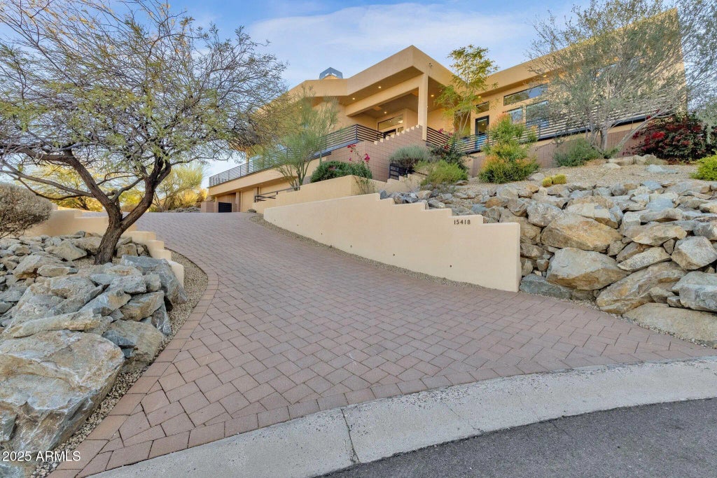 This luxurious 4-bedroom, 4-bath home spans 3,914 sqft and offers an unparalleled combination of modern elegance and functionality. Located on a quiet cul-de-sac, it features an open split floorplan, breathtaking 360-degree views of Four Peaks, Red Mountain, Troon, and the Fountain, an elevator, floor-to-ceiling windows in living room, private backyard pool, covered patio and meticulous attention to detail throughout. The expansive master suite offers access to a private rear patio and front wrap-around deck, master bath has dual sinks, walk-in shower, soaking tub, and large walk-in closet. 3 more spacious bedrooms each include a full bath, walk-in closet, with exterior doors leading to pool and/or patios. Office includes closet and patio access. Flexible spaces include a den/media room with a full bath, closet, and pool/garden views, which can easily function as a 4th bedroom, and an office with large windows, a closet, and private patio/pool access, suitable as a 5th bedroom or workspace.