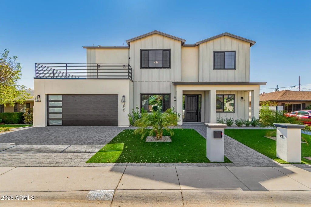 Farmhouse Meets California Coastal in Arcadia Lite - This one-of-a-kind contemporary custom home blends charm, style, and luxury, highlighted by an unparalleled 1,500 sq. ft. wraparound second-level deck with breathtaking Camelback Mountain & Piestewa Peak views. Designed for flexibility, the home offers a walk-out master suite on each level, both with spa-inspired baths, dual vanities, and oversized custom closets. The lower-level suite boasts a freestanding soaking tub and walk-in shower, while the upper-level suite adds a dedicated makeup vanity. Two additional bedrooms upstairs ensure space for everyone. An exterior spiral staircase connects the deck to the heated resort-style pool & spa, perfect for year-round entertaining. The chef's kitchen features Thermador appliances... quartz countertops, and abundant natural light. Open-concept living spaces include multiple dining/entertaining areas and a dedicated bar with wine & beverage fridge. Hardwood floors, 8' doors, and large windows elevate the interior. Extras include: covered patios on both levels with gas BBQ hookups, ceiling fans & heater wiring, speaker wiring extra-large laundry room, fire sprinklers, and an oversized garage door. Warranties include 5-year roof and 10-year deck coating. This home is the ultimate combination of design, function, and locationjust minutes from Arcadia dining, shopping, and lifestyle.