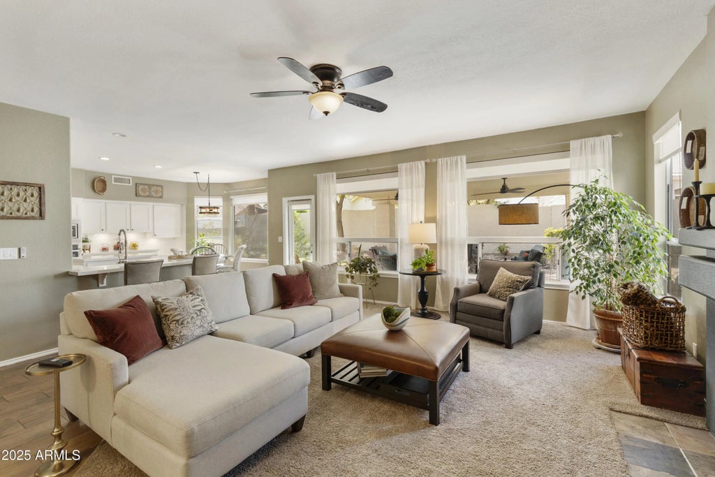 This beautiful turnkey home is located in the sought-out community of Fairways at the Foothills. The home features custom paint throughout, eat in kitchen and family room w/fireplace and a mountain view that flows to the backyard with its extended patio which is great for entertaining. and relaxation. Upgrades include ceramic wood-grain tile, custom kitchen herringbone backsplash, plantation shutters and custom Hunter Douglas Blinds, newly remodeled master bathroom, new carpet throughout and custom front door. Two dual speed Goodman ACs installed in 2024 with a 10-yr transferrable maintenance plan. Backyard boasts lush low maintenance landscaping. The loft upstairs is perfect for an office or can be converted into another bedroom. The home shows pride of ownership and is a must see.