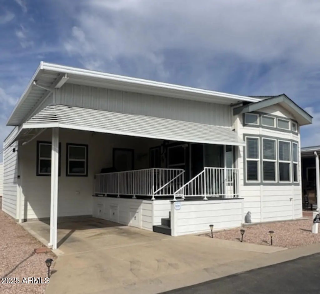 Resort living at its best in Beautiful Carriage Manor 55+ community where you OWN YOUR LAND!! Light and bright kitchen with eating area opens to the living room with sliders leading to large deck for entertaining. Custom built Arizona Room could be 2nd bedroom with ;Murphy bed and private bath. Some of the great features of this home are Laundry room with full size washer and dryer, 2 water heaters, whole house water softener, pullout storage drawers under the deck, covered parking, full size refrigerator, storage shed and includes all the furniture and furnishings. House is set on concrete not gravel. Move in ready so come and enjoy! EXCLUDE SECURITY CAMERAS.