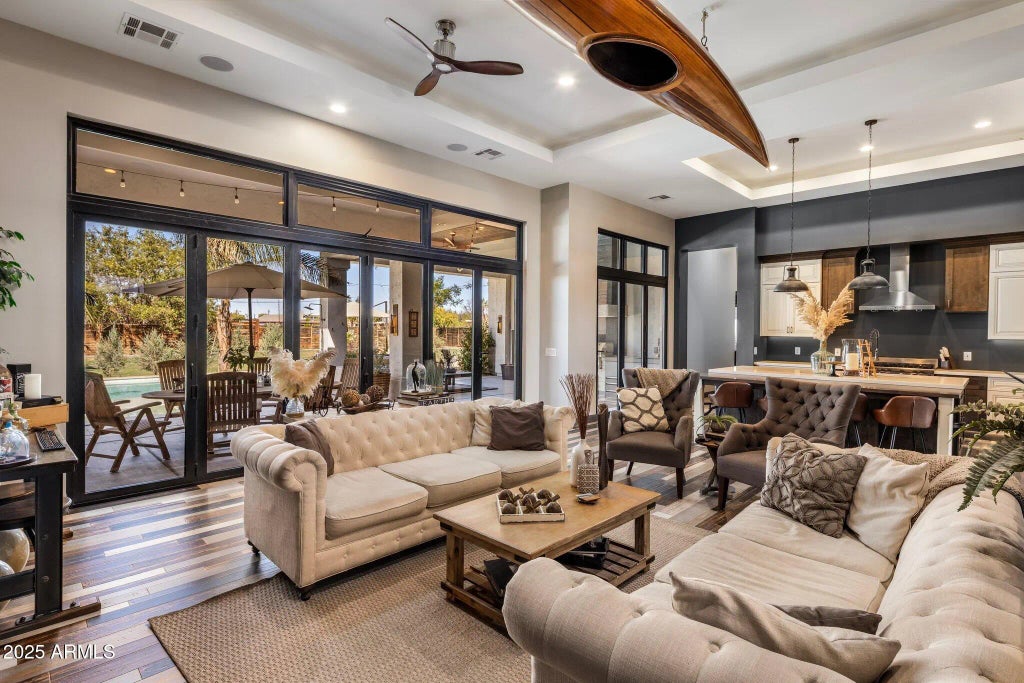 THE PERFECT SPLIT FLOORPLAN!! Featuring 4,604 sf of total living space, including a 3,235 sf- 4/4 Main House and 1,369 sf 2/1 Guest house. Main house boasts 4 bedrooms, separate office and playroom- there is plenty of space for everyone. The kitchen features tall custom designed cabinetry with counter lighting, 60' fridge/freezer, Wolf Range, separate ice maker, and TWO dishwashers. The huge island seats 6 and the tech drawer makes sure everyone's device is charged. 12' lighted tray ceilings, hardwood/tile/carpet flooring, and a mud room. The laundry room has plenty of folding space, cabinetry, and even homework desk areas. This resort style, NON-HOA property is situated on just over 1 acre with a 1,369 sqft guest house, long driveway, RV gate, and lots of mature landscaping. The 2/1 guest house supports the owned solar system and has had a tenant since 2006 and will continue leasing if you'd like. Why not have them pay some of your mortgage? The home has all of the upgrades including an oversized 3 car garage with 18' doors, electric car plug, 220v outlets for the big tool lover, tankless water heaters, spray foam insulation, garage cabinetry, and plenty of outlets for whatever you need plugged in. The huge primary suite has separate closets, a free standing soaking tub that fills via laminar flow from the ceiling. A huge double head shower and just outside you'll find an outdoor shower that's intimately private. Designed to entertain with bi-folding patio doors, massive grass yard, built in BBQ, pool, and outdoor showers. What else could you need?