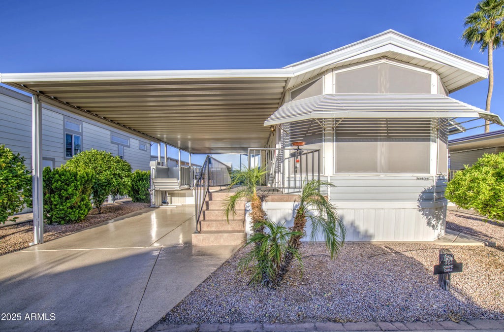 This is a great Park Model with 2 lemon trees, a blood orange and tangerine tree and several lovely bushes in Carriage Manor Resort, a premier 55+ Community where you OWN THE LAND! Outside you have an oversized beautiful deck with freshly painted railings that was built sturdy enough for a future AZ room. It also has an epoxy coated driveway. The dual paned windows have sunscreens on every window and the roof has been insulated roof. The A/C is only 1 year old. Inside you have laminate flooring throughout and updated lighting. Full size appliance in the kitchen. The bathroom has been completely updated with a toilet, vanity and a walk-in shower. The living room has a brand new smart TV and this home comes completely furnished and ready to be moved into. Carriage Manor has 24/7 onsite security, a heated saltwater pool/spa, fitness facility, Tennis, Pickle ball, Golf Club, Onsite heated pool/spa, nice fitness facility, Tennis, Pickle ball, Golf Club, Billiards, Lapidary/Silversmith, Sewing, Wood shop, Bingo, Dances parties & many more activities & amenities.