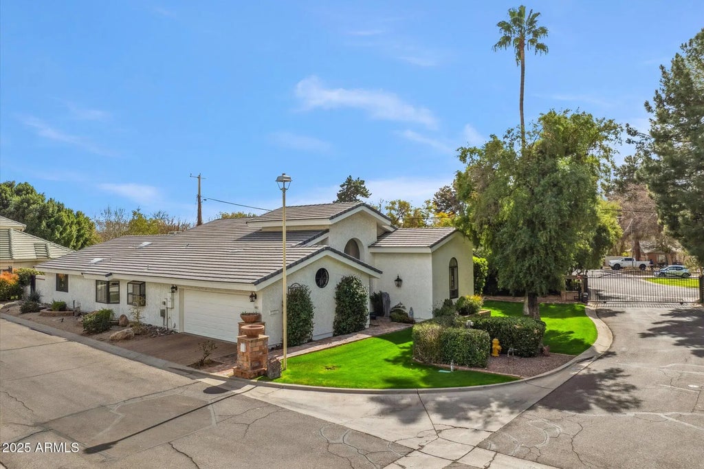 Discover a rare opportunity in North Central Phoenix. Inside a gated community of only eight custom residences. This architectural gem blends modern comfort with timeless design, showcasing 18-foot vaulted ceilings, dramatic arched windows, and a thoughtful split floor plan for privacy. The primary suite features vaulted ceilings, spa-inspired bath, and direct access to the backyard retreat. Two additional bedrooms include a versatile guest suite/home office highlighted by a one-of-a-kind library wall with built-in staircase, Murphy bed, and private entry which is perfect for today's flexible lifestyle. At the heart of the home, the grand living room with wet bar opens into a sunlit Arizona room enclosed in Pella windows with soaring 10 foot ceilings. The gourmet kitchen is outfitted with stainless steel appliances, dual wine coolers, and a custom dining nook that flows into a cozy den. Outdoors, towering hedges and a tranquil fountain create a secluded retreat with room for future expansion. The HOA maintains the lush front lawn, ensuring year round curb appeal. With surround sound wired throughout the home and patio, every detail has been crafted for indoor-outdoor living at its finest. A true North Central Phoenix masterpiece. Private, sophisticated, and move in ready.