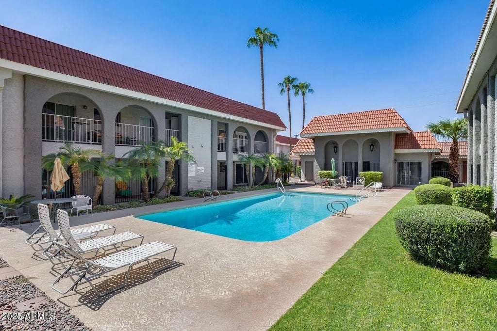 2-bedroom 2 bathroom condo in a great location is now available! Conveniently located near shopping, dining & all of Scottsdales finest offerings! Inside you'll be welcomed by bright and spacious living areas perfect for relaxing after a day on the town. The galley kitchen displays white cabinets, decorative tile backsplash, granite counters, SS appliances and looks out to the pool. The primary bedroom offers access to the balcony as well where you can enjoy your morning coffee with views of the pool and palm trees. Visit the community's sparkling pool and cool off on hot summer days! What's not to love? Come see it before it's too late!