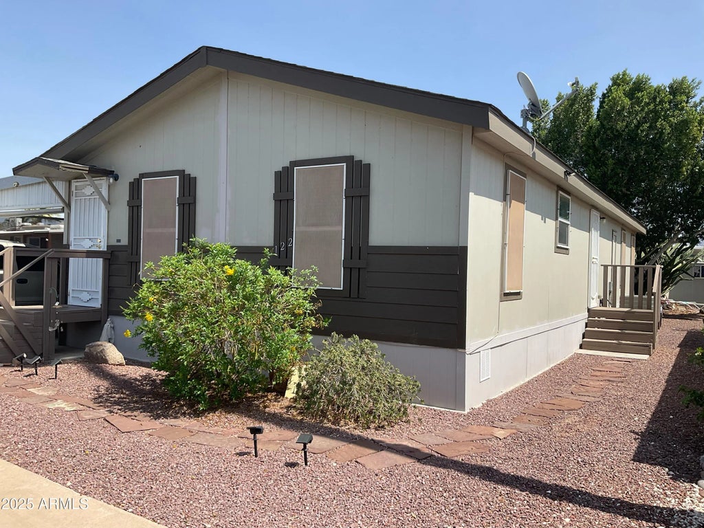 Welcome to this beautifully maintained 3-bedroom, 2-bath manufactured home in a vibrant 55+ community in Apache Junction. All furniture minus personal items included Beautiful floors throughout the home, never have to vacuum carpet again! Originally a 2-bedroom with a den, the home has been thoughtfully converted to include a third bedroom, while the second bedroom currently serves as a bright and functional office space. Built in 2016 and offering 1,248 sq ft of comfortable living, this home combines modern updates with cozy desert charm. Step inside to find upgraded hardwood flooring in all three bedrooms and an open-concept living area perfect for entertaining. The kitchen boasts all-new appliances, including a newly added dishwasher and reconfigured cabinetry for improved flow and function. Enjoy breathtaking views of the Superstition Mountains from your newly built back patio complete with stylish patio furniture and the perfect setting for outdoor relaxation. Additional upgrades include a new privacy screen on the carport, providing protection from wind and debris, and a pull-down driveway shade to make evening outdoor dining even more enjoyable. This move-in-ready home is a perfect blend of comfort, style, and low-maintenance desert living. Don't miss your chance to be part of this friendly, amenity-rich 55+ community!