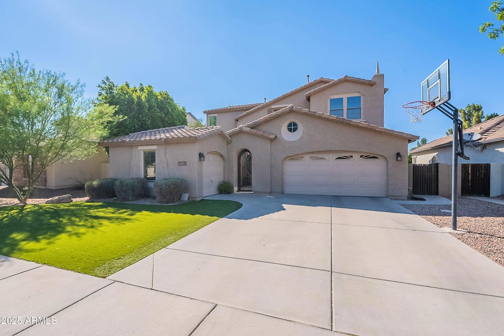 Your Dream Home in Spectrum at Val Vista—Ready for Fun & Comfort! Prepare to be wowed by this stunning 5-bedroom + loft, 3-bath home with fresh paint throughout, LVP flooring upstairs, and cozy carpet, it's as stylish as it is move-in ready. The chef's kitchen is a showstopper, featuring sleek white cabinets, granite countertops, stainless steel appliances, a gas range, and a walk-in pantry. Plus, the formal dining room is perfect for entertaining with its charming wood beams. Your private master retreat is the perfect escape, complete with dual walk-in closets, a garden tub, separate shower, and double vanities. But the magic doesn't stop there—check out the backyard oasis with a play pool, outdoor BBQ area, and a putting green to keep you entertained for hours! Attached casita area which comes with its own half bath, offering flexibility for guests, a home office, or extra privacy. The garage is upgraded with epoxy flooring for a sleek finish. This home isn't just a place to live- it's a place to thrive!