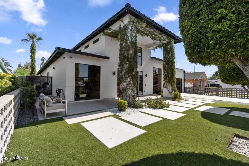 This custom built 2018 contemporary home offers nearly 2800 square feet of thoughtfully designed living space, featuring a 2370 square foot main residence with three bedrooms, a spacious office, and three and a half bathrooms. The detached 400 square foot guest house includes a full kitchen, bathroom, and large bedroom, making it ideal for multi-generational living or guest accommodations. The interior showcases soaring 20 foot ceilings, custom LED lighting, and a built in 30 speaker sound system throughout. The chef's kitchen is outfitted with Viking appliances, quartz countertops, and a striking Italian designed vent hood. The primary suite features a stunning spa inspired bathroom and an oversized custom closet. Each bedroom offers generous storage with large closets and premium finishes. The backyard includes a private pool added in 2019, creating a perfect setting for relaxation and entertaining. Additional features include a fully air-conditioned attached garage, smart thermostats, and a 16 camera security system with interior and exterior coverage. This is a rare opportunity to own a modern, high quality custom home in one of Phoenix's most desirable neighborhoods. A must see to truly appreciate the detail and craftsmanship.