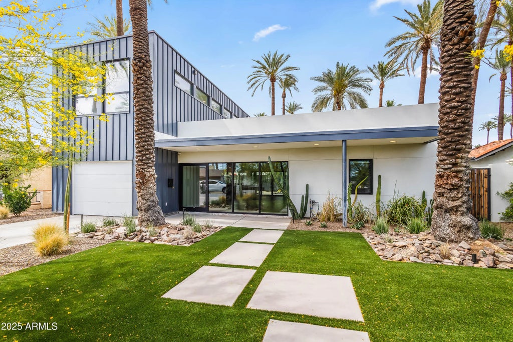 Arcadia Lite modern living at its finest in this beautifully designed contemporary masterpiece by acclaimed architect Eric Spry, located in the desirable Dateland Homes neighborhood in. Showcasing a clean, contemporary aesthetic, this residence boasts a lush front lawn, creating a welcoming curb appeal. Inside, the open-concept layout seamlessly connects the living and dining areas, centered around a sleek kitchen featuring honed marble countertops, a large island, and premium stainless steel appliances—ideal for both everyday living and entertaining. A flexible den/living area flows into a spacious bedroom that opens onto a generous covered patio, perfect for indoor-outdoor Arizona living. Upstairs, the private master suite offers a tranquil retreat with a custom-designed marble sink, luxurious travertine shower with rain head, and a thoughtfully designed layout. A versatile loft space provides the perfect home office or creative workspace. Situated just moments from Kachina Park, the Arizona Canal multi-use path, LGO, and more, this home offers the perfect blend of privacy, design, and location in one of the city's most exciting up-and-coming areas.