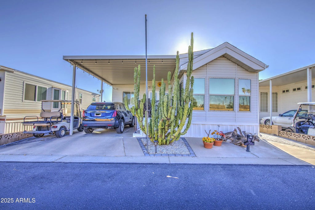 This 2002 Park Model with AZ room built in 2020 is in a great location in Carriage Manor Resort, a premier 55+ Community where you OWN THE LAND! Enjoy the cacti out front while you watch the sun come up over the Superstition Mtns on your tiled deck with powder coated rails and not having anyone across the street. You'll also enjoy pavers all around the home so no worries about weeds. Inside you'll find updated stainless steel appliances as well as reverse osmosis. Most of the windows are dual pane and this home comes with 2 hot water tanks, 20gal & 30gal, and dual ducts for the A/C & heat. The bedrm has a king size bed. The main bthrm has a tub while the 2nd bath in the AZ room has a walk-in shower and separate full size washer & dryer. With full offer, golf cart to convey at $0 value. Carriage Manor has 24/7 on site security, a heated saltwater pool/spa, fitness facility, Tennis, Pickle ball, Golf Club, Onsite heated pool/spa, nice fitness facility, Tennis, Pickle ball, Golf Club, Billiards, Lapidary/Silversmith, Sewing, Wood shop, Bingo, Dances parties & many more activities & amenities.