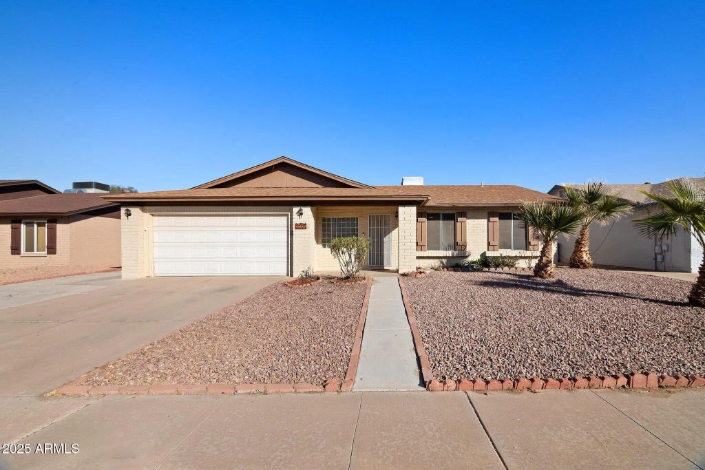 Enter through the foyer and step into the bright main living area with a single-slope vaulted ceiling and skylight that fills the space with natural light. The kitchen features quartz countertops, stainless steel appliances, a breakfast bar, and a pass-through counter that opens to the Arizona room, ideal for a dining space, home theater, gym, or office. A dedicated laundry room sits between the kitchen and the attached two-car garage. Down the hall, you'll find two bedrooms and the full bathroom before entering the primary suite. The primary suite is a standout feature with two large closets, a remodeled ensuite bath, and an adjoining flex space ideal for a quiet escape lounge, office, or nursery.