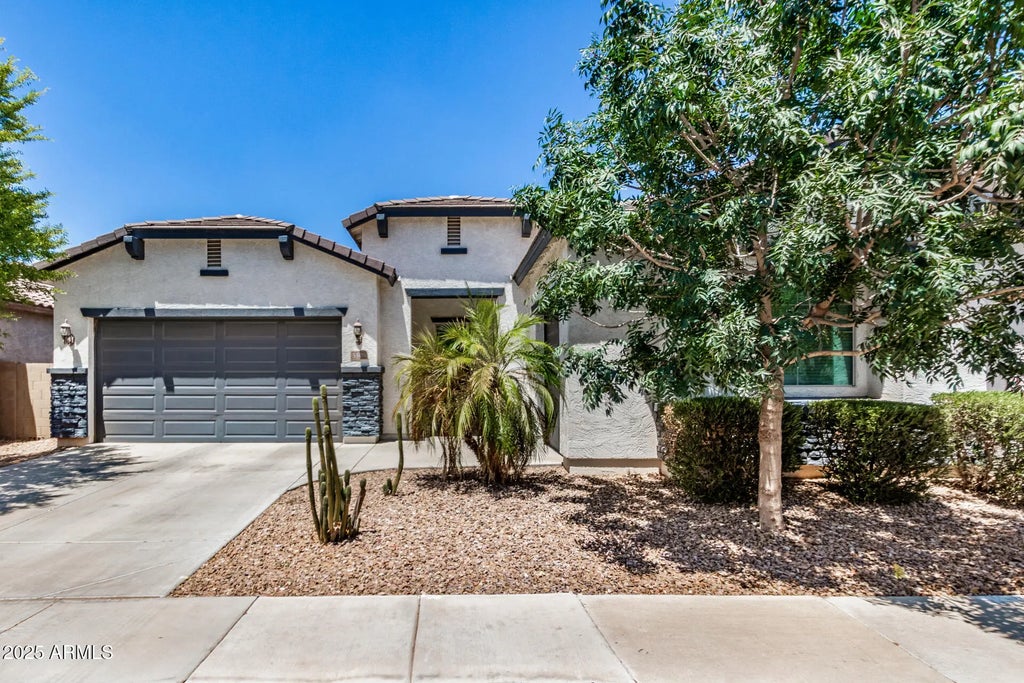 Home, sweet home! Explore this delightful 3-bedroom residence with a 3-car garage, tasteful stone accents, and a charming desert landscape. You're welcomed by a serene living room with high ceilings, recessed lighting, blinds, and durable tile flooring for easy maintenance. Adjacent, you'll find an open den ideal for an office or study. Create lasting memories in the family room, complete with sliding doors that lead to the backyard for seamless indoor-outdoor living. The eat-in kitchen comes with granite counters, ample cabinetry with crown moulding, chic pendant lighting, a tile backsplash, SS appliances, an island, and a two-tier peninsula with a breakfast bar. The primary bedroom offers an ensuite with double sinks, a lavish raindrop shower, and a spacious walk-in closet. Spend enchanting moments in the lovely backyard, complete with a covered patio, pristine artificial turf, and a refreshing pool for cooling down on hot days. Make it yours now!