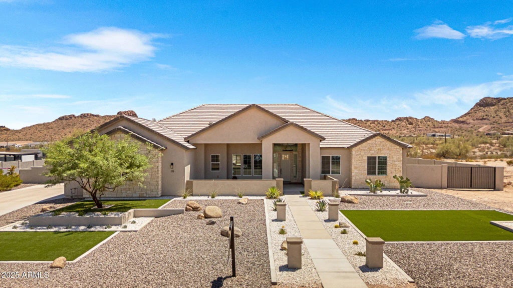 NO HOA! Experience this stunning home on 1+ acre of land on a *PREMIUM lot with unobstructed mountain views and a natural preserve behind this home. This 3011 sq ft 4 bed 3 bath, home PLUS an office, and formal dining area has plenty of space for the whole family. Open kitchen and great room layout is perfect for large gatherings. Custom white cabinets and quartz countertops with stainless steel appliances for a timeless kitchen. Laundry room features custom storage. Home features 10ft & 12ft ceilings along with 2x6 construction and spray-foam insulation for maximum energy efficiency. Sparkling pool with plenty of travertine, turf, and sunken entertaining area, double-sided fireplace and MASSIVE covered patio. Plenty of room for a shop and large RV, boat or toy storage/parking.