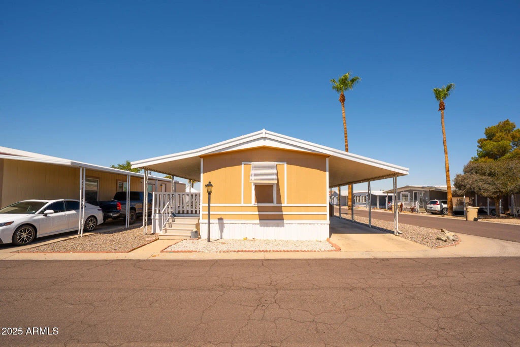 Welcome to this well-maintained 2-bedroom, 2-bath mobile home situated on a desirable corner lot. Inside, you'll find fresh new carpet and laminate flooring throughout, along with ceiling fans in every room for year-round comfort. The spacious primary suite features a private bathroom with a separate soaking tub and walk-in shower. Enjoy the convenience of an indoor washer and dryer, included with the home. The covered carport provides easy access with a ramp leading to the sliding glass entry door. Relax on the fenced front porch — perfect for pets, plants, or simply enjoying the breeze. Don't miss this clean, move-in ready home with great features inside and out!