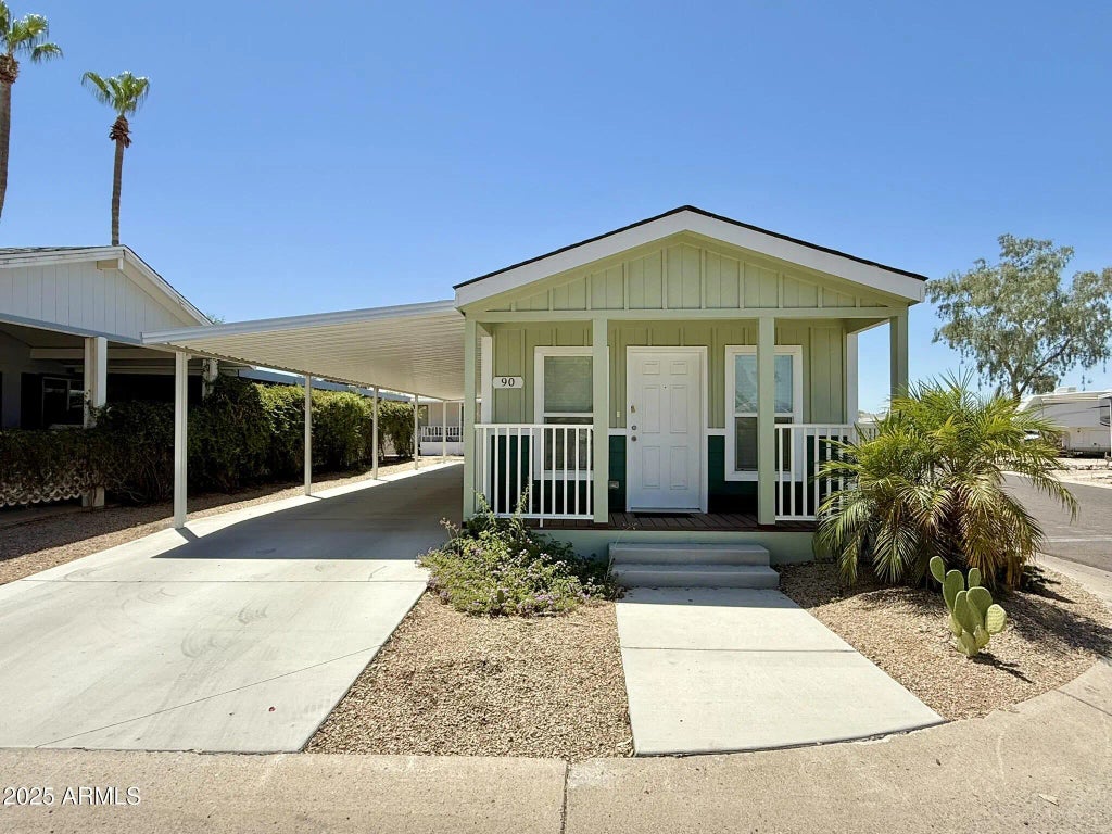 Step into comfort and convenience in this beautifully maintained 2-bedroom, 1-bath Cavco home, built in 2021 and nestled on a spacious corner lot in the sought-after Casa Del Sol East III community in Peoria. This light-filled home features an open great room layout with a stylish kitchen island, rich brown shaker cabinets, and a seamless flow perfect for both entertaining and everyday living. Enjoy the convenience of indoor laundry, modern finishes throughout, and a deep carport with space for two vehicles.