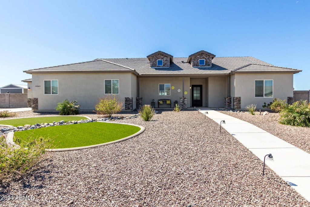 Beautiful 4-Bedroom Home on 1 Acre. Owner will pay off solar loan with an acceptable offer, giving you long-term energy savings and peace of mind. This home offers exceptional space, quality upgrades, and versatile functionality both inside and out. $80k spent on front and backyard landscape. Step inside to an open floor plan featuring an elegant iron & glass front door, wood plank tile flooring, and brushed nickel lighting. The bright kitchen offers granite countertops, a deep farmhouse sink, white cabinetry, and stainless steel appliances. The spacious primary suite includes a double sink vanity and a custom-tiled walk-in shower. Step outside to a huge extended covered patio and a fully fenced Step outside to a huge extended covered patio and a fully fence backyard with block walls for privacy. The landscaping features 8 Indian Laurel trees, 4 palm trees, and 3 citrus trees. All plants are supported by an automated irrigation system and front yard sprinkler system. Bonus Features: 4-car garage and garage includes a mini-split 30-amp RV plug and extended driveway for additional parking 2x6 exterior walls for added insulation and durability This home offers the perfect blend of comfort, efficiency, and modern Arizona living - all on a spacious, beautifully maintained acre.