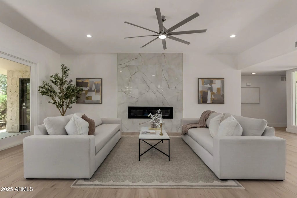 Experience luxury in this beautifully remodeled 3 Bed/3 Bath gem in the coveted, guard-gated Sandpiper Community. This stunning home bathed in natural light underwent a complete transformation. Floor plan was modernized to make a huge open concept kitchen and great room, 2 primary suites, outdoor access from all bedrooms, and more. A glass pivot front door welcomes you, with luxury finishes including Italian porcelain tile, quartz countertops, new appliances with a gas range, oversized waterfall island with built-in micro and wine fridge, fireplace, new doors and baseboards, elegant fixtures, extra storage, and more. New A/C unit and gas furnace. Enclosed courtyard has a grill and is wired for a TV. New epoxy flooring in garage with EV charging station and a new modern garage door. This gorgeous turnkey home can now be yours!