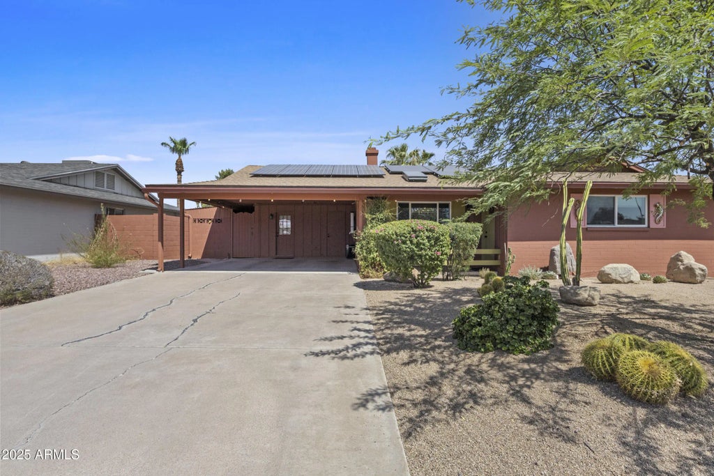 Beautifully well-maintained 3-bedroom, 2-bath home on a desert-landscaped corner lot in Tempe's desirable Alameda Meadows community. This home features tile and bamboo flooring, colorful accent walls, updated doors and hardware, and a refreshed kitchen with updated cabinets, countertops, and a built-in pantry. The primary suite offers his-and-hers closets, updated bathroom cabinets and countertops, a walk-in shower, and private access to the backyard and pool. Additional features include a heated and cooled Arizona room, skylight, fireplace, inside laundry, carport with access to covered side yard storage, new windows, new roof (2023), RV gate, an owned solar storage battery for optimal electric vehicle charging and utility efficiency, and a pool with new pump and equipment. All this located in the heart of Tempe near ASU, the airport, shopping, schools, and freeways for easy access, and much, much more!