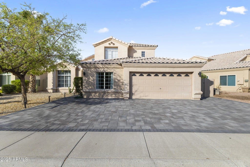 Move-in ready home with 4 bedrooms, 3 bathrooms, plus den. Large formal living and dining room with vaulted ceiling. Kitchen is updated with new appliances, open to breakfast nook and family room. Family room has electric fireplace. Main floor has all neutral wood-look tile. Den, one bedroom, and full bathroom are downstairs. Master bathroom is updated with huge walk in shower and double sink vanity. Upstairs has 2 additional bedrooms with access to the jack-jill bathroom with their own sink and vanity. 2 Trane AC units are BRAND NEW September 2025. All paver driveway gives extra curb appeal. Low maintenance front yard. Backyard has a pool, grass, and built in planters. No HOA. Close to great public and charter schools.
