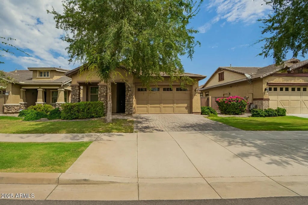 Elegant single-story residence in the highly desirable Morrison Ranch community. This home features welcoming front porches, tree-lined streets, lush community parks, and beautiful lakes. The split floor plan offers privacy, with the primary suite situated on one side of the home and three additional bedrooms on the other. This retreat features a walk-in closet, dual vanities, soaking tub, and a separate shower. The open-concept great room showcases coffered ceiling and connects to a gourmet kitchen with granite countertops, stainless appliances, large island, and walk-in pantry. Enjoy effortless indoor-outdoor living with expansive sliding doors that open to the covered patio, creating the perfect space for relaxing or entertaining.