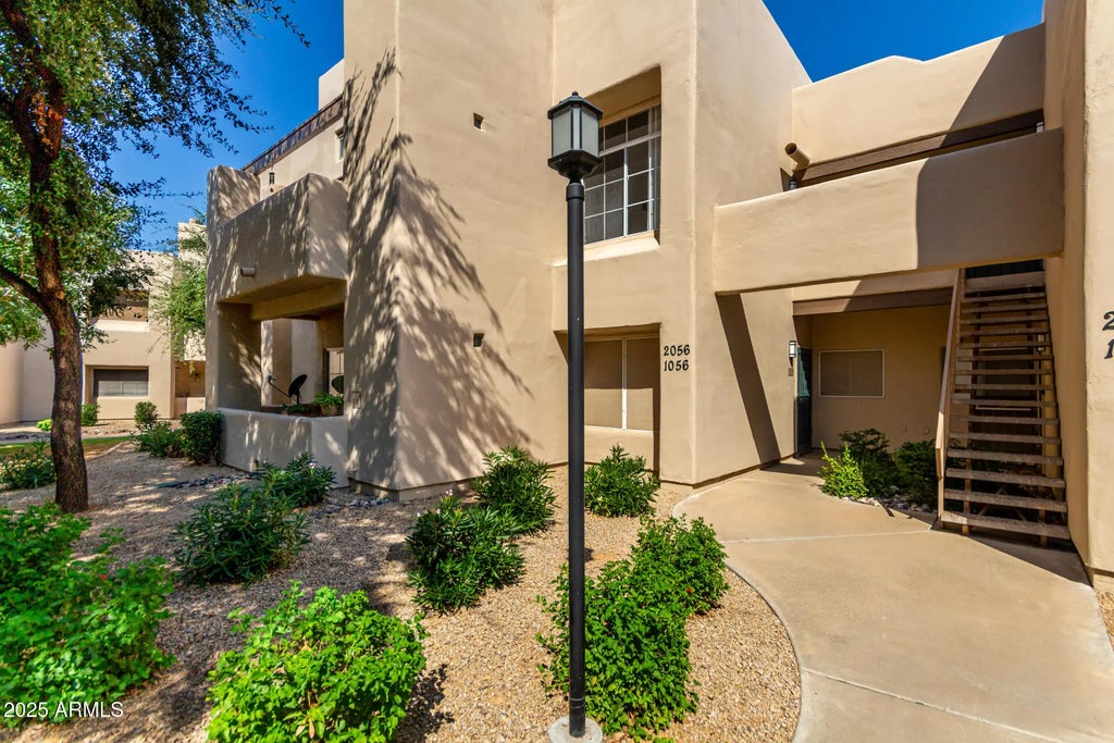 Well-cared-for ground-level 2-bedroom, 2-bath condo, perfectly located near shopping, dining, and golf—Scottsdale living at its best. Charming Santa Fe-style community with lush landscaping, two sparkling pools, relaxing spas, tennis courts, BBQ grills, and fitness center. Step inside this bright and inviting unit featuring ceramic tile and luxury vinyl plank flooring. The kitchen is equipped with stainless steel appliances, a glass-top stove, pantry, and convenient laundry closet. The great room is an entertainer's dream, featuring a formal dining area, cozy fireplace, and direct access to the private patio. The split primary bedroom features a walk-in closet and an ensuite bathroom with a spacious glass-enclosed shower. The secondary bedroom is ideal for guests or a home office, featuring double doors and a closet. The secondary bathroom includes a tub and shower combination. Move-in ready near biking and walking paths, as well as gorgeous hiking trails.
