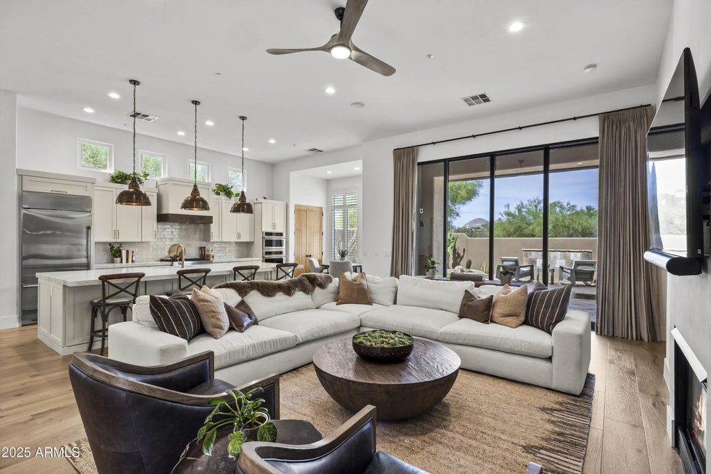 Positioned on one of the best view lots in the prestigious guard-gated Grayhawk Raptor Retreat, this residence captures sweeping views of Pinnacle Peak, the McDowell Mountains, and the 11th hole of the Raptor Golf Course. Fully renovated inside and out in 2025, the home blends modern elegance with warm, organic design. Inside, wide-plank white oak floors flow throughout, complemented by Taj Mahal quartzite surfaces, custom cabinetry, and new high-end appliances. The spacious primary suite offers a relaxing sitting area and thoughtfully designed Classy Closets. Two additional bedrooms in the main home, with one currently being used as an office, provide flexibility, while a detached casita with its own bath creates a private retreat for guests. Designed for both comfort and convenience, this true lock-and-leave property features two outdoor fireplaces, fresh exterior paint, and low-maintenance desert landscaping. The three-car garage includes epoxy floors and built-in cabinetry, and a heated pool and spa located directly across the street allow for resort-style enjoyment without the upkeep. Located just a short walk from Isabella's Kitchen, Local Bistro, and Grayhawk's social and golf amenities, this home offers a rare combination of style, views, and a prime location in one of Scottsdale's most sought-after communities.