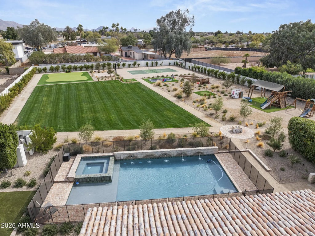 Rare opportunity in the highly sought-after Cactus Corridor. Designed by Blaine Drake, this charming ranch-style home sits on a 46,000+ sq ft lot—one of the largest in the neighborhood. The private, resort-style backyard features authentic Chicago brick hardscaping, outdoor kitchen, stone water features, fire pit, and a newly built heated pool/spa with both electric and propane options. A 200-year-old limestone trough from France serves as the yard's stunning centerpiece, surrounded by lush landscaping with hundreds of mature trees and plants. Recreation abounds with a large putting green, pickleball/basketball court, nearly 7,000 sq ft of natural grass, children's play area, and a garden. Inside, the 3,300 sq ft home offers 4 bedrooms, open living spaces, a flex room/office, and chef's kitchen with Wolf/Sub-Zero appliances. An oversized 3-car garage provides ample storage with room to expand. Truly one of the Corridor's most distinctive properties.