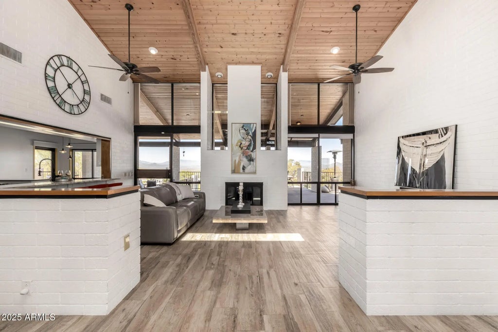 One level home, top of the world views on 1 Acre golf course lot. Architecturally stunning. Expansive balconies with views. Interior showcases 20'+ vaulted wood ceilings, beautiful flooring, floor-to-ceiling fireplace & wall of windows, tons of natural light & a neutral palette. Chef's dream kitchen featuring a wood accent ceiling, white cabinetry, built-in appliances & an island. Primary bedroom is generous w/ office/sitting area & private exit to the deck to enjoy the views, a walk-in closet, and updated bath with double sinks, separate shower & tub. Amazing mountain views, and unwind on the patio. This home features incredible scenery, ideal for relaxation. Split plan offers 2 additional bedrooms & guest bath in addition to the main room powder bath. Quiet area yet convenient to Shea.