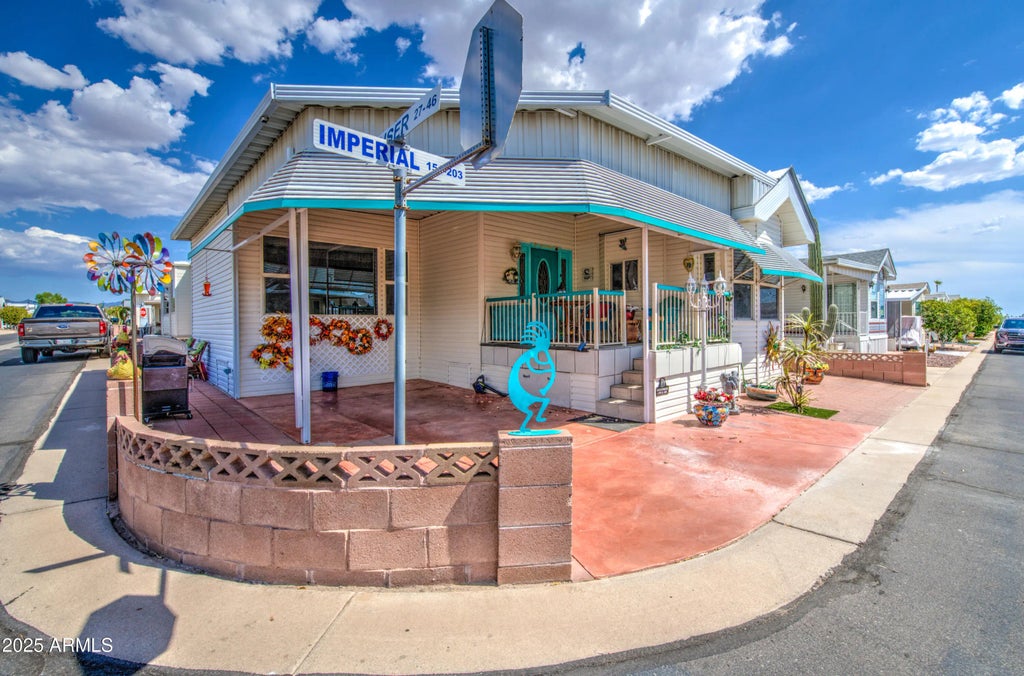 This gorgeous house is on a west facing corner lot in Carriage Manor Resort, a premier 55+ Community where you OWN THE LAND! It has a very large kitchen in the front of the Park Model with a moveable island and full size appliances including a dishwasher and stained glass windows. The main bath is a 1/2 bath with closet although closet is plumbed for a shower should you choose. In the AZ room you'll find another bath with a stand up shower. It also has a full size stackable front load washer/dryer plus an additional storage area. Golf Cart included w/ full price offer. Carriage Manor has 24/7 onsite security, heated saltwater pool/spa, fitness facility, Tennis, Pickle ball, Golf Club, Billiards, Lapidary/Silversmith, Sewing, Wood shop, Bingo, Dances parties & many more activities & ameni