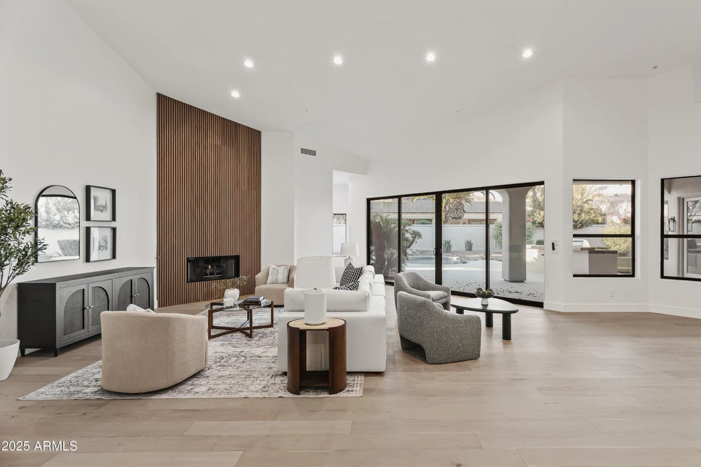 Indulge in luxury living with this renovated, turnkey 5-bed, 4-bath estate, located in the prestigious, guard-gated Stonegate community. Tucked away on a private cul-de-sac, this home radiates elegance with rich wood floors, high-end kitchen appliances, abundant natural light, and an open-concept layout. The chef's kitchen flows effortlessly into the expansive great room, where vaulted ceilings, a striking fireplace, and a sleek wet bar create the perfect setting for both relaxation and entertaining. Step outside to the ultimate backyard retreat, featuring a covered patio, extended seating area, built-in BBQ, lush turf, and a resort-style pool with a captivating stone waterfall. Enjoy an array of world-class amenities, including pickleball, tennis, basketball courts, heated pools, and scenic walking trails. This exceptional home blends modern sophistication with unmatched convenience and refined elegance.