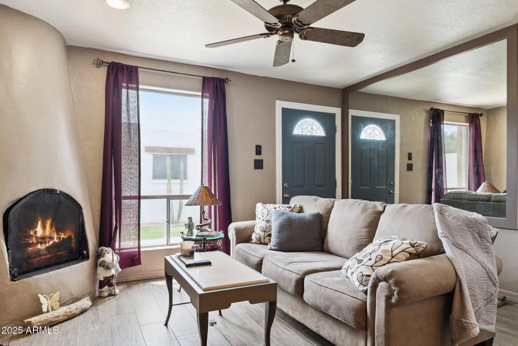 South Scottsdale Gem. Modern townhome with Urban Southwest Vibe. This ''move-in ready'' 2-bedroom, 1 bath townhome has been thoughtfully designed with comfort, style & function in mind. Every detail adds personality while maintaining a clean, modern feel. Step inside to find ceramic wood-look porcelain tile in the main living areas & warm laminate flooring in the bedrooms - no carpet anywhere! The living room highlights include an Adobe-style fireplace, wall-mounted TV setup with hidden outlets for a sleek look, art niches, & a statement mirror that reflects light & movement throughout the space. The kitchen blends charm & practicality with a custom herringbone backsplash, stainless steel appliances, & a cozy breakfast area. Just off the kitchen, the laundry area features a beautiful washer and dryer. Both bedrooms are comfortably sized & feature mirrored closet doors to maximize light and space. One bedroom also has hidden outlets behind the TV for a clean, modern aesthetic. The spa-like bathroom offers an attractive walk-in shower with stylish tile surround. Additional upgrades include matching modern ceiling fans, dimmer switches to create perfect mood settings, matching outlets and switches, and a reverse osmosis water filtration system for peace of mind. A separate storage room provides extra convenience. Enjoy the perks of community living with a sparkling pool right nearby, plus one covered parking space close to the unit (and an additional space included). Location is ideal too! Just minutes from Old Town Scottsdale with its great shopping & restaurants, hiking at Papago Park, and the cultural energy of Tempe. Don't miss this special home!