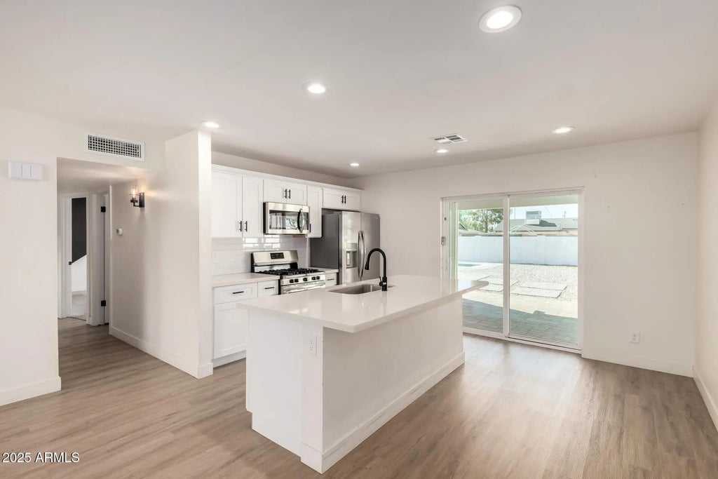Discover all the charm of this stunning single-story home with heated POOL! Designed with style and comfort in mind, this gem features an open-concept layout perfect for entertaining, showcasing wood-look flooring, abundant natural light, and neutral tones. The impeccable culinary space displays shaker-style cabinets adorned with crown molding, tile backsplash, solid-surface counters, stainless steel appliances, and an island with a breakfast bar, for those casual conversations over quick bites. All 3 bedrooms have carpet. The primary retreat hosts a closet and a bathroom for convenience. Out back, you'll have your oasis, complete with a cozy covered patio with well-laid pavers, perfect for relaxation, a built-in BBQ and a lush lawn in your very spacious backyard. plenty of seating space, and a fun and vibrant mural accompanying the sparkling pool, all creating a fantastic atmosphere for outdoor entertaining. What's not to love? Make it yours!