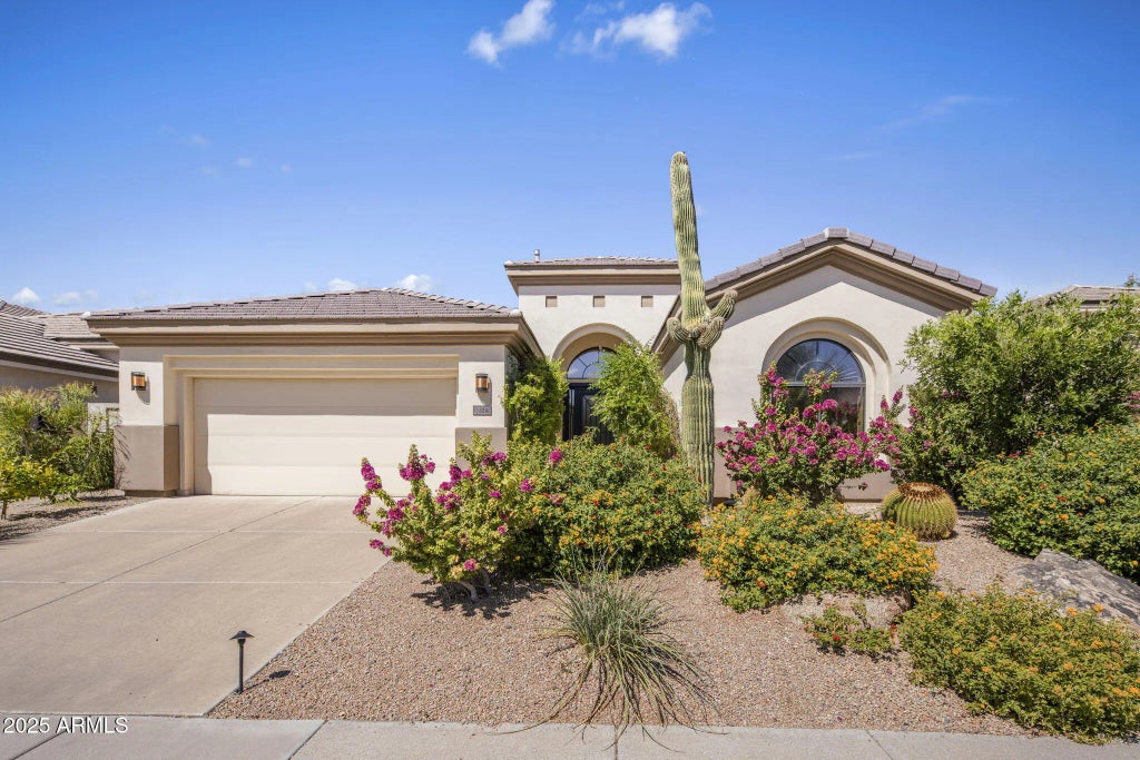 Sophistication, modern glamour and elegant living await in this recently remodeled, refined single level residence located in guard gated Talon Retreat of Grayhawk. Graceful arched passageways guide you into the heart of the home, where soaring ceilings and walls of windows flood the interiors with natural light. A seamless fusion of design and functionality flow throughout the open concept design, featuring a chef's kitchen with crisp white shaker cabinetry with contrasting black hardware, glass-front uppers and striking black granite counters accentuated by textured full-height backsplash. An expansive island with seating anchors the space, making it perfect for both everyday living and entertaining. Opening to elegant family and living rooms, timeless comfort is blended with architectural detail as tall windows offer garden views and a contemporary fireplace beckons for relaxation. The primary suite is no less welcoming, with floor-to ceiling glass doors opening to a private patio framed by lush greenery-an ideal setting for morning coffee or evening rest. The spa-like bath features dual vanities with stone counters and refined finishes for modern convenience. The second bedroom and third bedroom/office echo the sophisticated design with arched windows and custom touches. Outdoors, discover a private desert oasis with sparking pool and natural rock waterfall, shaded dining spaces and multiple areas for lounging. Vibrant landscaping with palms and bougainvillea ensures both privacy and resort-like ambianceperfect for serene relaxation or lively gatherings.