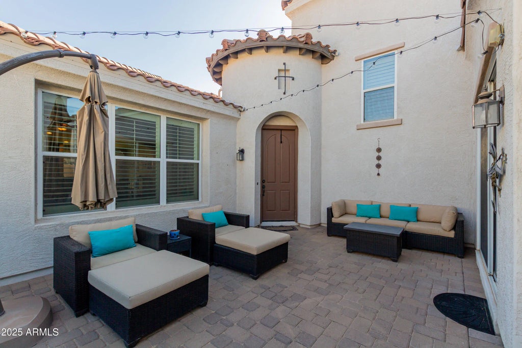 Welcome to this stunning Tuscan-style home located in the desirable La Sentiero community of Queen Creek. A brick paver driveway and wrought iron gate open to a charming courtyard with access to both the main residence and a private 1 bedroom/1 bathroom casita; perfect for guests or multigenerational living. The main home offers 2 bedrooms, 2 full bathrooms, and a spacious upstairs loft that can be used as a bonus room, office, or media space. Designer builder upgrades, the gourmet kitchen features granite countertops, a center island, a large breakfast bar, and rich finishes. The primary suite creates a spa-like retreat with a walk-in shower, dual sink vanity, and elegant mosaic tile accents. Shutters throughout. Newer Interior Paint and Newer flooring to stairs and Loft area. Step outside to enjoy Arizona living at its best in the fully landscaped backyard with a newly extended large covered patio area and pergola as well as a built in BBQ and outdoor lighting; ideal for entertaining or relaxing. Front yard landscaping just had an update as well with new plants. La Sentiero offers walking paths, playgrounds, and greenbelts, while nearby shopping, dining, and entertainment add everyday convenience. Schnepf Farms is just minutes away, and recent Rittenhouse Road improvements provide easy access in and out of the community. Don't miss the opportunity to own this beautiful home in one of Queen Creek's most sought-after neighborhoods!