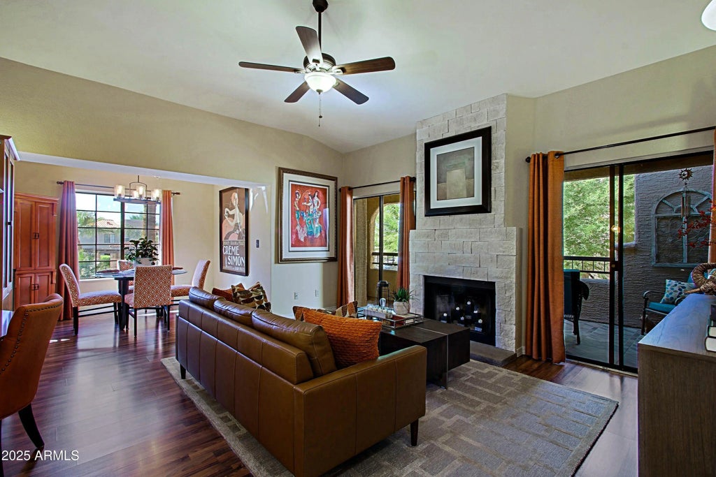 Beautifully remodeled 2 bedroom, end unit with vaulted ceilings in a resort-style community in the heart of McCormick Ranch. Open floorplan with lots of natural light. You get a feeling of warmth & comfort as soon as you walk inside. Kitchen features include all new appliances, new quartz counters, new disposal, dual sink, pantry, and undercabinet lighting. Enjoy the very private tiled balcony with view of grassy grounds & pool, access from primary bedroom and great room, and storage closet w/4 yr old water heater. Other features include new hardware on all doors & cabinets, security door, floor to ceiling new stone on fireplace. Community features sparkling pools, hot tub, pickleball, tennis, & walking paths. Water is inc in HOA. Close to greenbelt, golf courses, shopping, dining & hwy