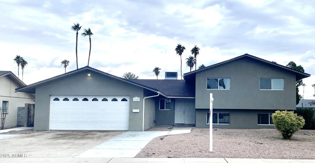 Welcome to this spacious 6-bedroom, 5-bathroom tri-level home in the desirable Tempe Gardens community! With 2,765 Sq Ft of living space, this property is designed to accommodate multigenerational living, comfortable working from home, quick commute to ASU, easy access to freeways, and anyone needing plenty of space. The home had a large remodel in 2021, including updated electrical, plumbing, HVAC, doors and wood trim, exterior stucco/paint, and new roof (in 2023). Main floor features a bright great room and updated kitchen with beautiful and durable LVP flooring, recessed lighting, walnut cabinetry, a kitchen island with breakfast bar, stainless steel appliances, and a charming bay window at the sink. A large family room or 7th bedroom with walk-in closet, full bathroom, large laundry room/pantry, and garage with 2 EV Chargers complete the main level. Upstairs offers 3 bedrooms, two with a shared bathroom with dual sinks plus a shower/tub combo, and a third primary bedroom with ensuite bathroom featuring double sinks and a step-in shower. The lower level adds 3 additional bedrooms and two updated bathrooms, one bedroom is also ensuite. There is plenty of additional off-street parking and the backyard is maintenance free and ready for play. With updated everything - this home is in a prime location and move-in ready.