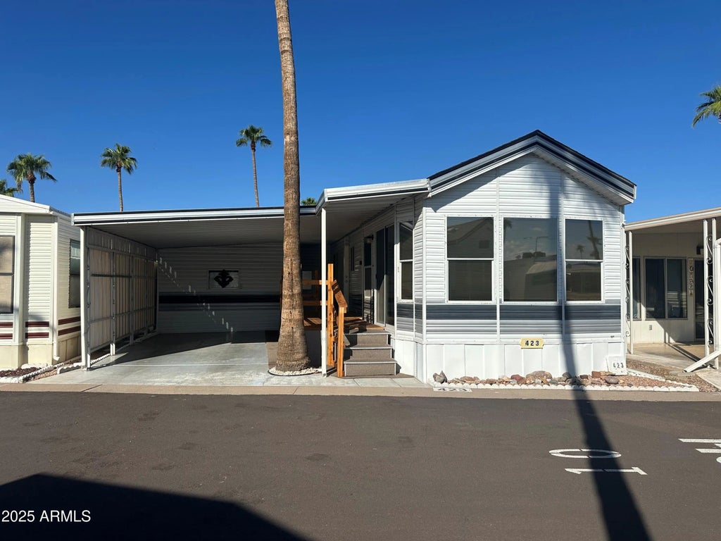 Welcome to Rock Shadows, a highly sought-after 55+ community! This beautiful furnished 1 bedroom, 1 bath home with a private driveway features a bright, open floor plan where the living room flows into dining area & kitchen. The galley kitchen offers abundant cabinets, generous counter space, and an efficient layout perfect for everyday living. Additional highlights include a custom oversized porch w/extra storage space under porch. The porch is ideal for outdoor dining, & entertaining. The private Laundry room/hobby shop/storage rm has extra storage. Rock Shadows offers a resort-style lifestyle with amenities such as shuffle board, spa swimming pool, fitness center, pickleball, dog park, Clubhouse/Rec room, & media room for community events. It's conveniently located minutes from US-60, shopping, dining, and medical facilities, this home provides both comfort and convenience in a welcoming neighborhood. ( Key Features: " Private driveway & $8k Honeywell heating & cooling unit " Galley-style kitchen with plenty of storage " Indoor laundry room for convenience " Oversized custom porch with lots of storage space for totes " Hobby shop/private storage room/shed " Resort-style amenities: pool, fitness center, tennis, pickleball & more. Don't miss your chance to enjoy affordable, low-maintenance living in this vibrant 55+ community!