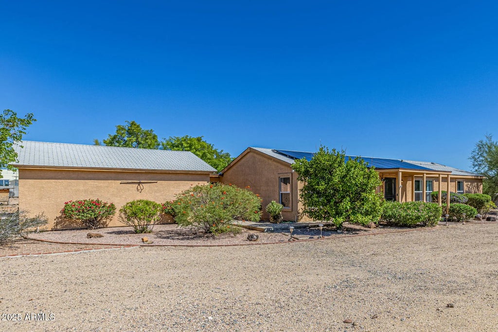 Beautiful, impeccably maintained ranch-style home set on over an acre with mountain views, no HOA, and thoughtful UPGRADES throughout! Enter a spacious, open-concept living area with vaulted ceilings and abundant natural light. The eat-in kitchen with breakfast bar is perfect for casual dining or entertaining, while the split floor plan ensures each bedroom has privacy, its own walk-in closet, and NEW carpet. The primary suite is a serene retreat, complete with a double vanity and walk-in shower. Step outside to a private backyard oasis featuring an expansive covered patio with a heated spa, ideal for relaxation. The fenced backyard offers natural grass and additional fenced area ideal for chickens, goats, or horses! Enjoy the benefits of a versatile workshop with attic space and A/C, along with a 2-car garage complete with a sink, workbenches, and shelving. Additional features include RV hookups (30-amp on the east side and 50-amp in the garage), leased solar system to help energy costs, RO system, NEW HVAC unit, and NEW tankless water heater. With abundant space and endless possibilities, this Desert Hills home is a rare find. Don't miss your chance to make it yours!