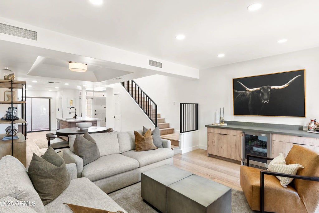 This stunning 2-bedroom, 2.5-bath golf course residence has been thoughtfully redesigned with modern living in mind. The main level was completely opened up, creating an effortless flow that's perfect for everyday living or entertaining guests. A newly added powder bath enhances both function and convenience. Refined finishes carry throughout the home, including Santa Fe-style wall textures, Waterworks tile, and Toto fixtures. A full-size LG ThinQ washer and dryer add everyday ease, while the kitchen stands out with a Café range, refrigerator, and wine fridge, paired with a Wolf microwave drawer and Bosch dishwasher. Positioned directly on the Biltmore golf course within the guard-gated Biltmore Courts I community, this home offers not only lush view of the 11th green but also access to resort-style amenities and a prime location near the Arizona Biltmore Resort, fine dining, and world-class shopping.
