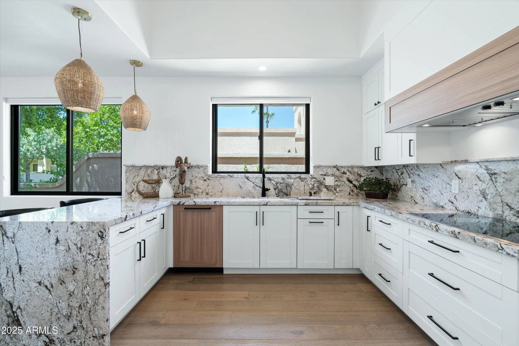 Beyond the canopy-covered courtyard, you're welcomed into a light-filled foyer with soaring vaulted ceilings that allow natural light to cascade throughout the space. To your left, the chef's kitchen impresses with organic stone elements, warm custom cabinetry, and top-tier finishes, creating an inviting place to cook, gather, and entertain. Adjacent to the kitchen, a charming breakfast nook overlooks the serene private courtyard. The heart of the home is the great room, anchored by a natural wood-burning fireplace with a striking stone slab surround that sets the tone for the entire space. This expansive area seamlessly integrates the living room, dining area, and wet bar, each accented with matching stonework for a cohesive and elegant aesthetic.