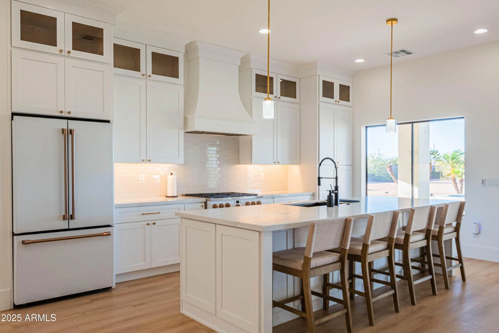 Fully reimagined luxury home on over an acre with city water! This stunning residence blends modern design with timeless quality. Every detail has been thoughtfully curated, from the level-4 smooth walls and wide-plank flooring to the quartz countertops, recessed lighting, and 7'' baseboards. The chef's kitchen is a showstopper, featuring all-new custom cabinetry, a 36'' LP range, 42'' hood, and an impressive 10' island with motorized outlets. A dedicated office with double glass doors and sleek black built-ins provides the perfect workspace. The primary suite feels like a private retreat, complete with a spa-style shower featuring three showerheads and elegant white oak cabinetry. All cabinetry throughout the home is brand new, combining modern function with refined craftsmanship. Step outside to your own resort-style backyard with a renovated pool, spa, soothing water feature, putting green, and expansive covered patio, ideal for entertaining or relaxing. With plenty of room for a casita, shop, horses, or RVs, this property offers both luxury and flexibility rarely found together. Please see documents tab for features list