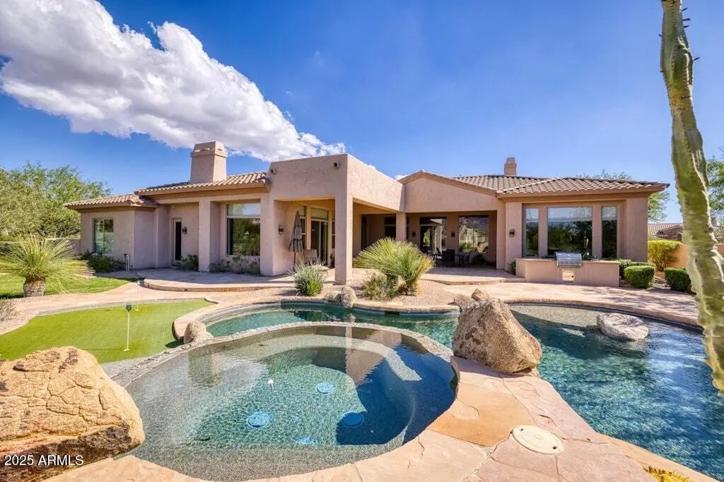 Welcome to your dream home in the prestigious gated community of Sierra Norte, in North Scottsdale. Perfectly situated on a serene corner lot on the edge of Carefree. This former model home boasts 4 spacious bedrooms and 41/2 baths, offering plenty of space for family and guests. Set on over an acre of beautifully landscaped grounds, this property provides the ideal backdrop for both relaxation and entertainment. Enjoy mesmerizing sunsets from your backyard every evening, where you can unwind by the pool or gather around the fire pit. The outdoor space is designed for ultimate comfort, featuring a spa, breathtaking views of the desert landscape, and a putting green, making it the perfect oasis for entertaining or enjoying quiet moments in nature. This home truly is a slice of paradise!