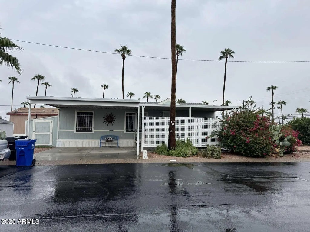 Welcome to this beautifully maintained 2 bedroom, 2 bathroom mobile home in Mesa. This home offers approx 960 sq ft of living space. As you enter, you'll find a spacious layout that includes a mix of warm wood flooring and carpeted areas. The kitchen features rich brown cabinetry, granite countertops, and stainless steel appliances—designed to be both beautiful and functional. Step outside to a covered patio, perfect for relaxing or dining al fresco.